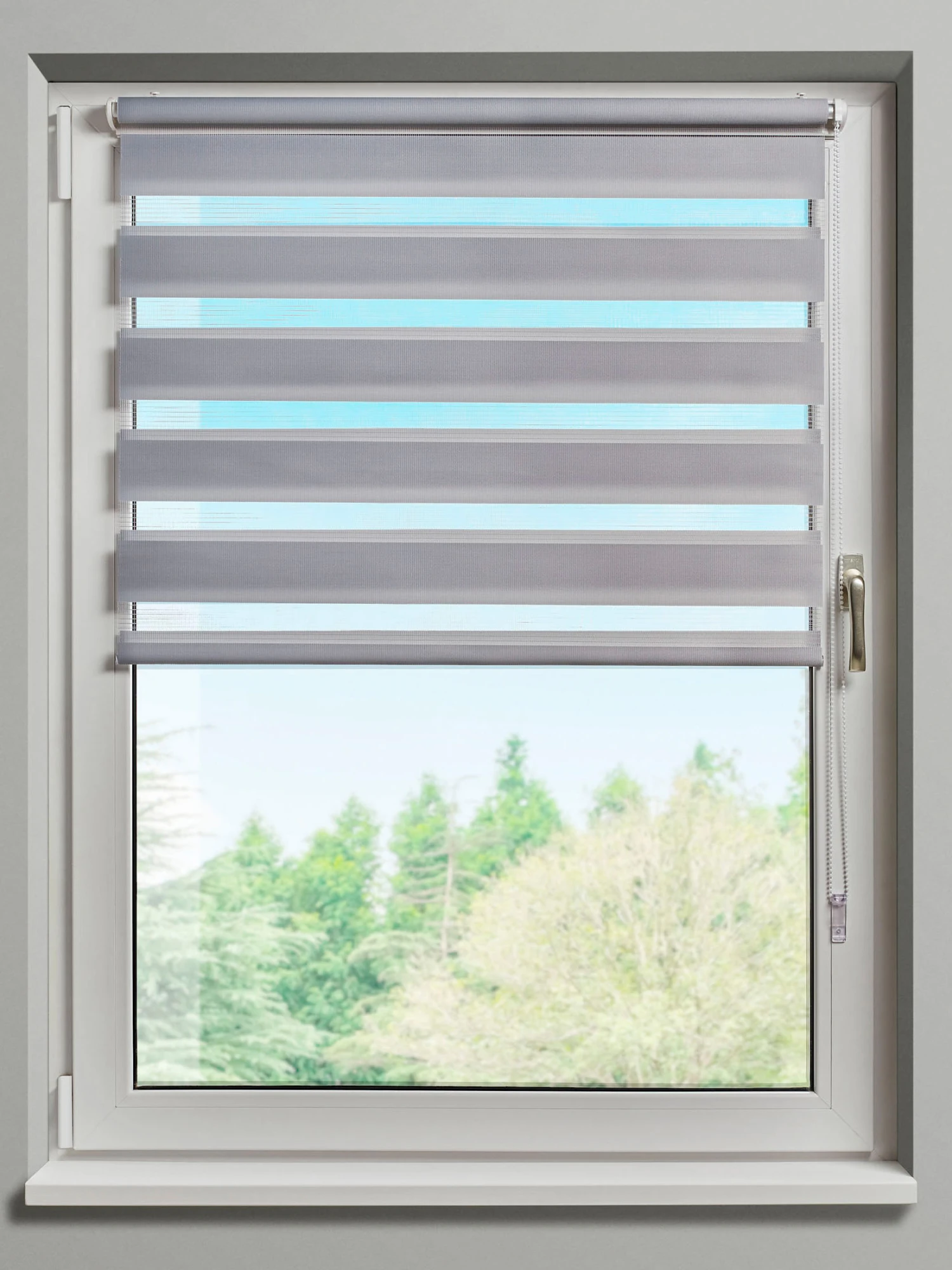 Beim DUO STARLIGHT liegen zwei Stoffbahnen übereinander, die wiederum transluzente und blickdichte Streifen haben. Je nach Stellung der Bahnen zueinander können Sie den Lichteinfall regulieren. Hierzu bedienen Sie ganz einfach den Kettenzug. Für die bohrfreie Montage am Fensterrahmen werden praktische Klemmträger mitgeliefert. Zusätzlich sind Clips für die Deckenmontage im Lieferumfang enthalten.