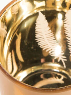 Teelichthalter aus Glas mit Laser Cut Motiv. Von innen gold verspiegelt mit Blätter-Motiv. Sorgt für gemütliches, warmes Licht.