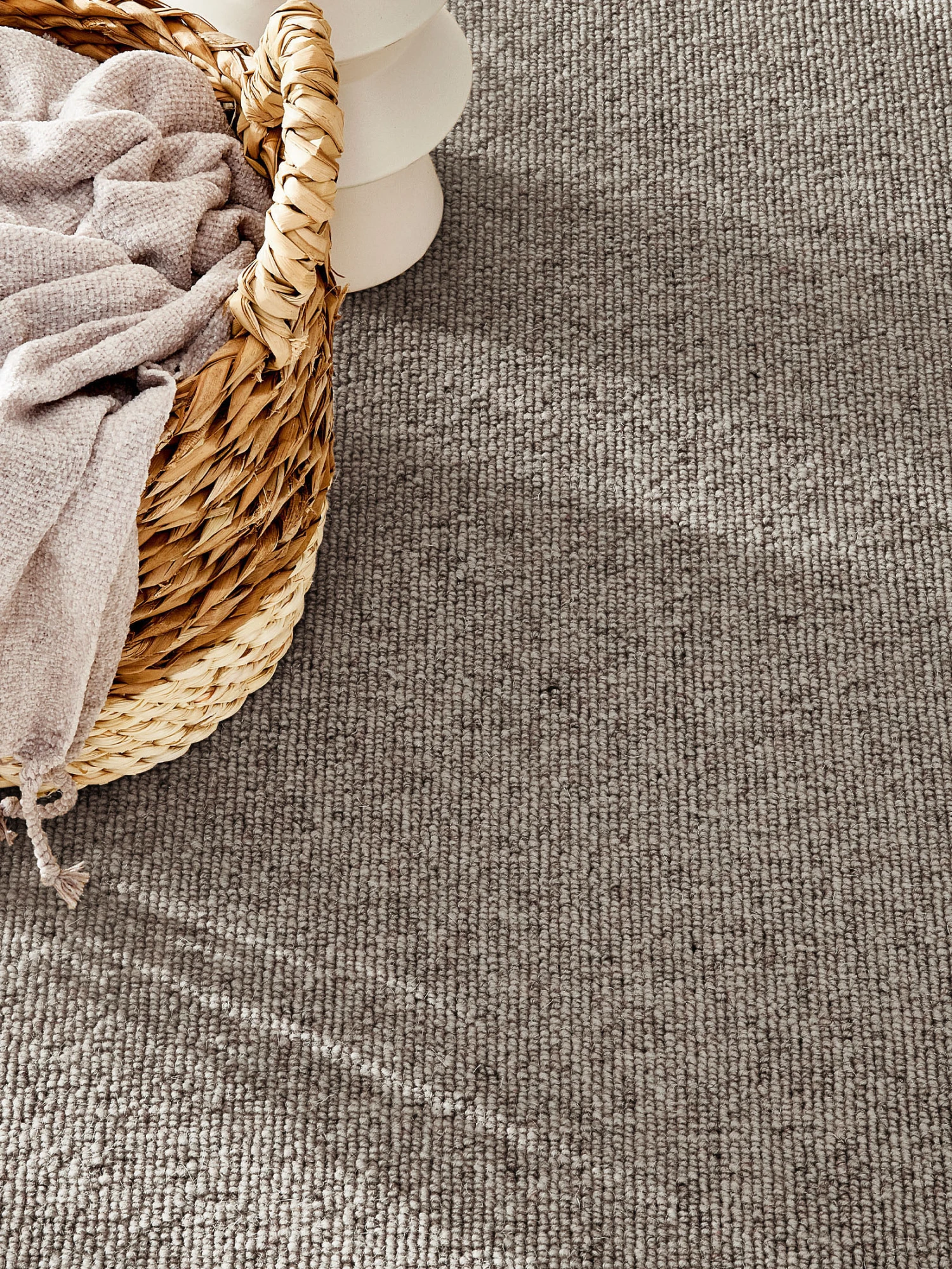 Klassischer, naturfarbener schwerer Woll-Teppichboden mit dezenter Zeichnung. Gesamtgewicht ca. 1670 g pro m². Höhe ca. 7 mm. Flor 100 %